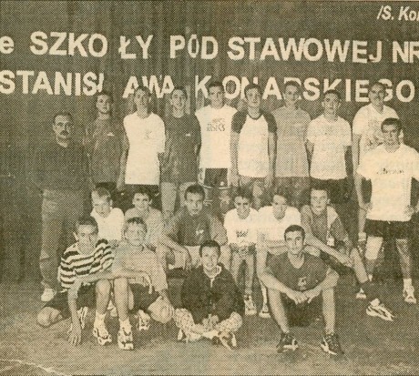 Zdjecie ze szkolnej siatkówki-lata 90 z trenerem, Czeslawem Skwarkiem. Rafał Karpała,i inni z klasy .
